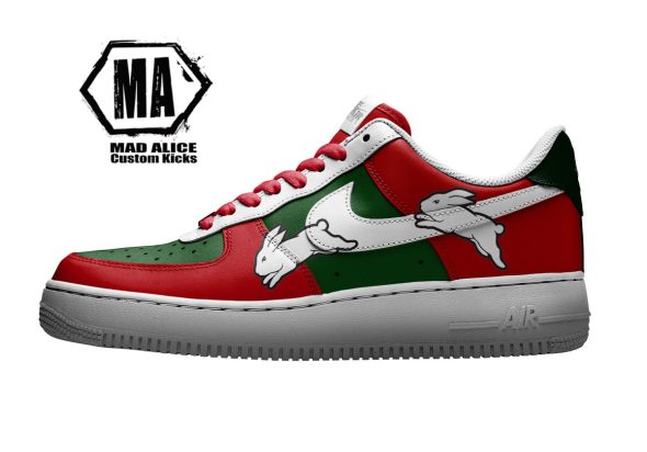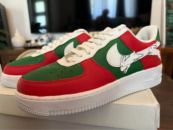 Nike air force 1 shoes customised in a Rabbitohs theme.