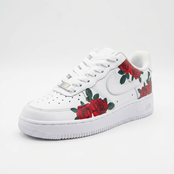 Make a bold statement with these custom Nike Air Force 1s, featuring hand‑painted red roses symbolising passion, strength, and timeless style. Set against the crisp white leather of the classic AF1 silhouette, the rich red florals create a striking contrast that’s impossible to ignore.