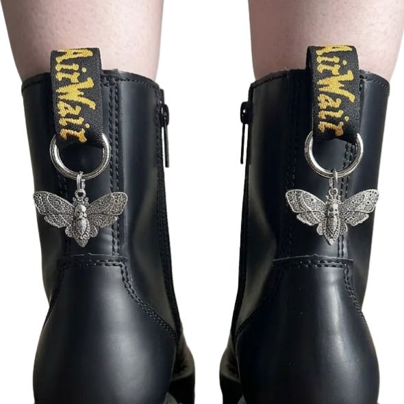 Add a touch of edgy elegance to your Doc Marten boots with our Silver Moth decorative charms. These intricately designed charms feature a striking skull face, seamlessly blending gothic aesthetics with nature-inspired beauty. Crafted with meticulous attention to detail, each charm attaches effortlessly to the back of your boots, providing a bold statement piece that sets you apart from the crowd. Perfect for those who dare to be different, these charms are not just accessories, but a reflection of your unique style. Sold as a pair.